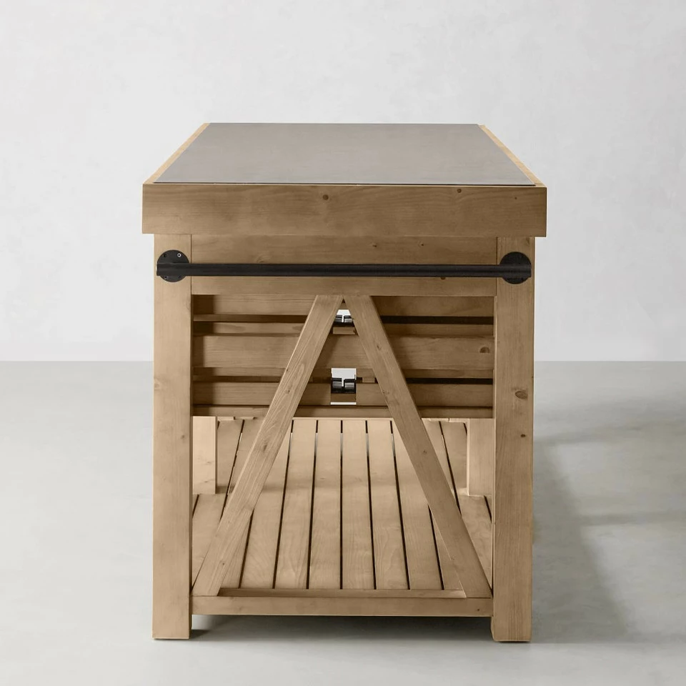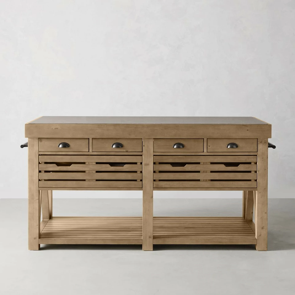 Our handcrafted island creates a beautiful, functional focal point for the kitchen. Drawers on both sides offer ample storage for everything from prep tools and mixing bowls to cutlery and dinnerware, while a broad lower shelf stows small appliances or pantry staples.