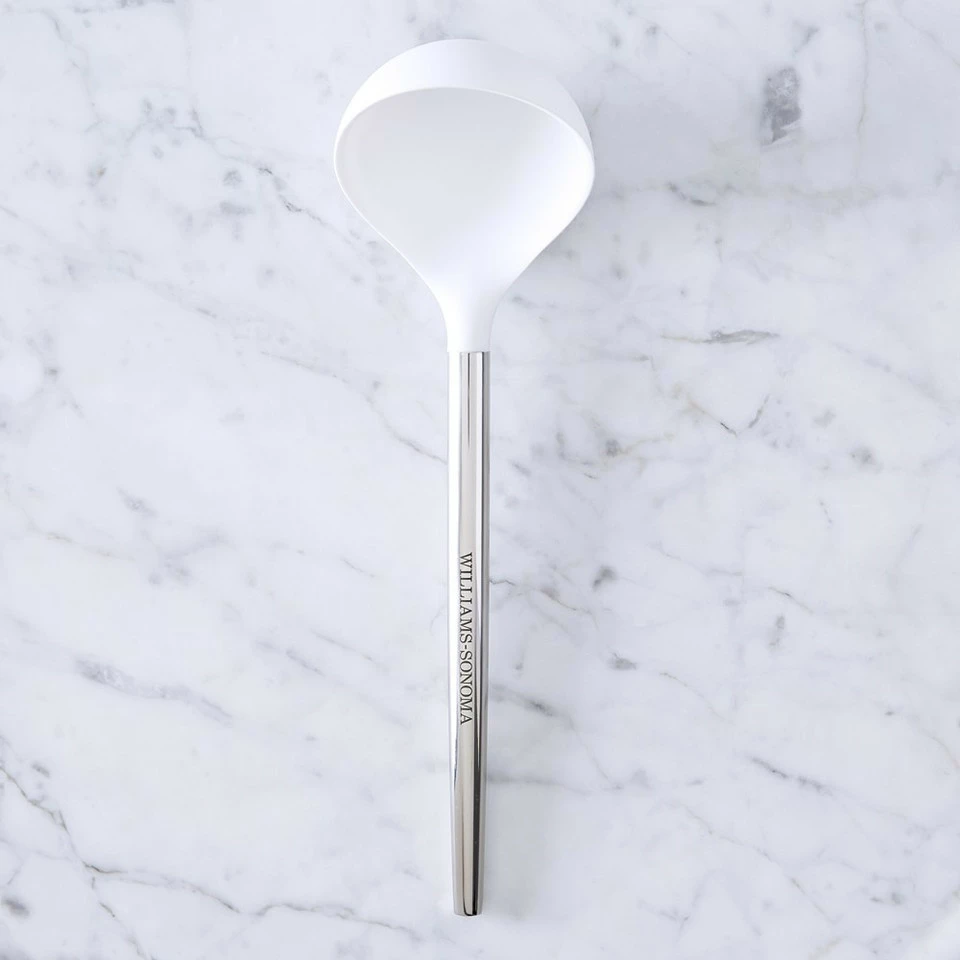 Our Silicone Utensils collection is made of silicone and nylon for the perfect combination of flexibility and hardness. This ladle has a flexible silicone front to reach into the corners of pans, scooping up every last drop, while the nylon bowl holds its shape for no-spill transfer of liquids.