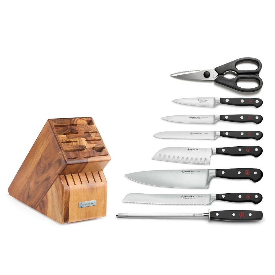 Crafted in the renowned knife centre of Solingen, Germany, the Wüsthof Classic knives in this set have specially formulated high-carbon-steel blades that hold a keen edge. Full tangs increase balance, and the triple-riveted polypropylene handles ensure a comfortable grip.